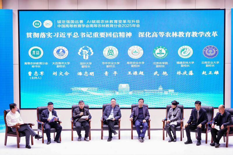 圆桌论坛上,南京农业大学副校长王源超、华中农业大学副校长青平等7所高等农林高校领导围绕“贯彻落实习近平总书记重要回信精神,深化教育教学改革”展开深入研讨,交流各校在新农科建设、AI赋能、产教融合等方面的实践与探索。