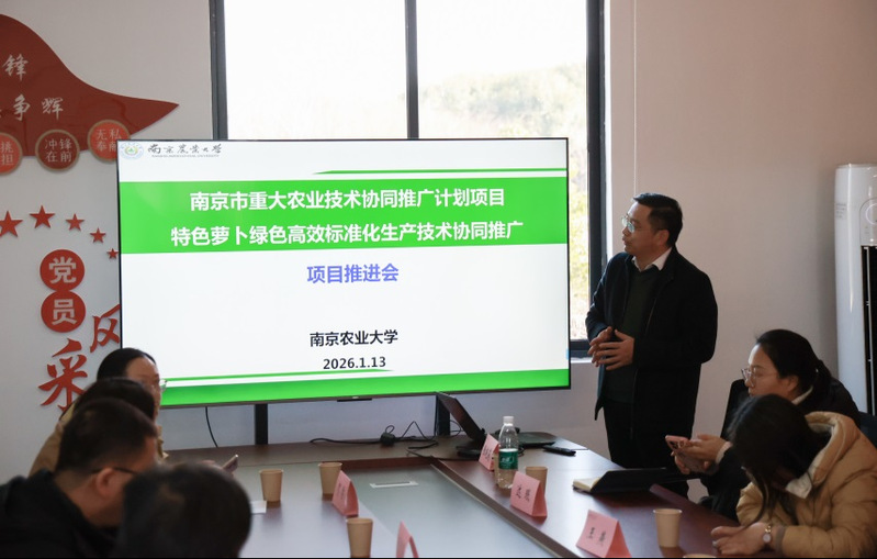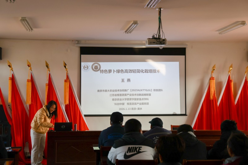 2026年1月13日,我校主持实施的南京市农业重大技术协同推广计划“特色萝卜绿色高效标准化生产技术协同推广”项目【2025NJXTTG(06)】培训观摩与推进会在溧水示范基地成功举行。本次活动由我校牵头组织,南京市农业农村局科教处朱亚楠主任、溧水区农业农村局葛庆松副局长、校社会合作处王克其科长、项目首席专家柳李旺教授与服务团队成员,以及项目参加南京南京普仁有机农业有限责任公司、南京市六合区冬日艳丽蔬菜专业合作社、江苏归来兮生态农业开发有限公司、南京龙盘里农业科技有限公司等单位负责人、技术骨干、种植大户等共40余人参加会议。活动通过“理论培训+基地现场观摩+交流研讨”形式,扎实推进项目实施。