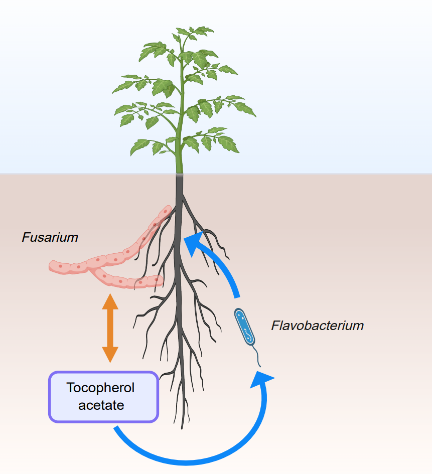 该领域以往研究多集中于单一作物或局部土壤环境,缺乏跨系统的整合分析,限制了普适性规律的发现。本研究通过Meta分析整合了来自多个独立研究的根际微生物组数据,并结合代谢组、宏基因组、转录组等,系统揭示了镰刀菌侵染下根际微生物组的功能与结构变化规律。此外,研究团队创新性地提出了“操作性分析单元”概念,将来自不同地点、不同寄主植物的根际样本,在尽可能相同的条件下进行分组比较,以剥离环境噪音,捕捉真实的病害信号。研究发现镰刀菌侵染可稳定地改变根际细菌群落结构。其中,黄杆菌属在发病植株根际显著富集,并可抑制病原菌生长。进一步研究通过代谢组鉴定到发病植株根系分泌物中的生育酚显著富集,该物质能促进根际黄杆菌生长。黄杆菌与生育酚联合使用可显著降低番茄枯萎病的发病指数,并有效提升根际黄杆菌丰度。研究成果为开发基于“有益菌-根系分泌物”协同的土传病害生态调控策略奠定了重要理论基础。