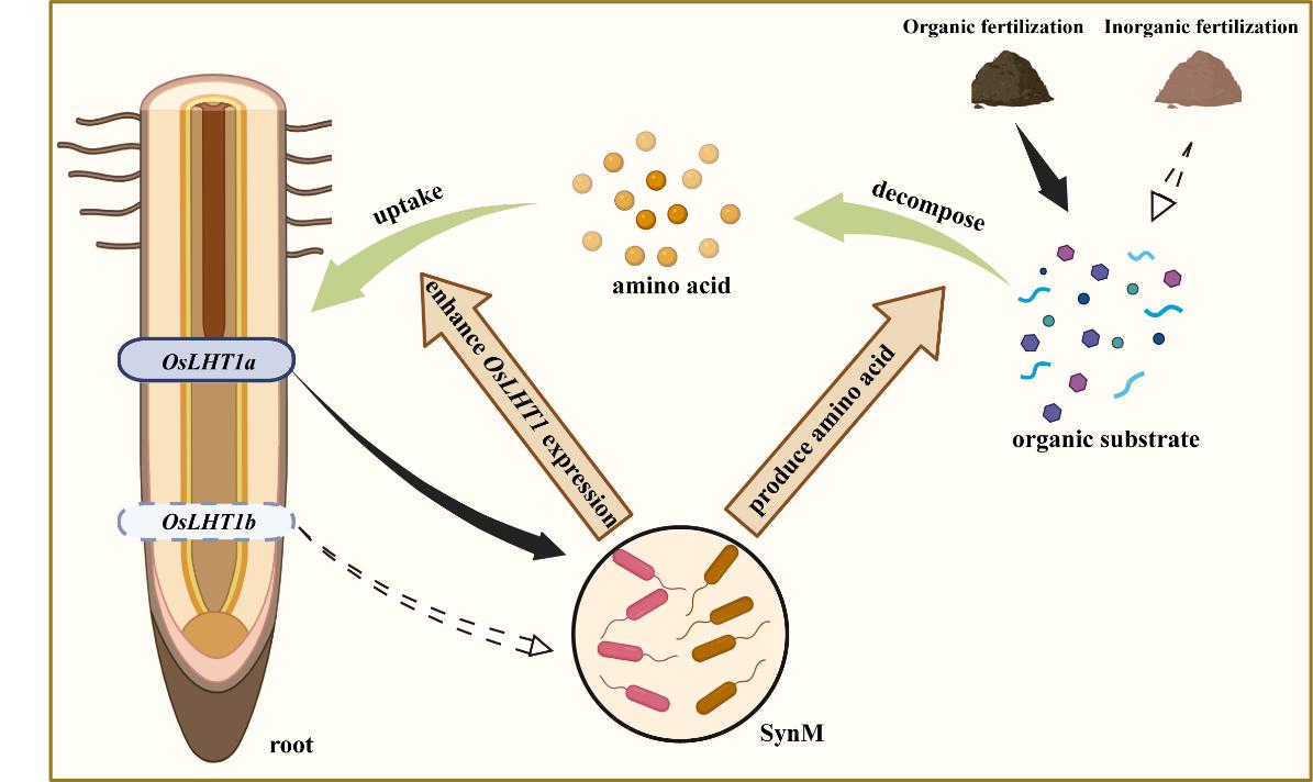 土壤中90%以上的氮素以有机氮形式存在,而其生物有效性依赖于土壤微生物的分解作用。研究团队前期发现水稻氨基酸转运蛋白OsLHT1基因的遗传变异使粳稻的氨基酸吸收能力显著高于籼稻。在该项研究中,通过全国水稻主栽区不同品种与土壤肥力的调查,发现OsLHT1a单倍型(主要为粳稻)的氨基酸高效吸收性状与其主要有机质高的种植环境及根际富集的功能微生物特征相关。利用从粳稻根际筛选的富集菌株,构建了具有协同提高水稻氨基酸吸收效率的合成菌群SynM。该菌群提高水稻根系吸收氨基酸(15N标记的天冬氨酸)达1.4倍。利用oslht1突变体及回交材料,明确SynM的根际组装过程主要受OsLHT1基因控制,并且该组装过程可以通过“遗留效应”促进后茬水稻对有机氮的利用。田间条件下,SynM与有机肥配施,可显著提高有机肥的当季肥效,水稻增产12.4%。该研究揭示了“宿主基因调控-根际菌群耦合-培肥措施强化”的协同机理,为培育有机养分高效作物新品种提供了微生物协同育种新途径和新靶标。