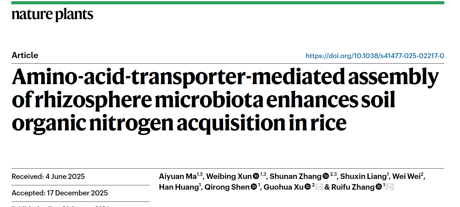 近日,南京农业大学沈其荣院士团队张瑞福教授课题组与徐国华教授团队合作,在国际权威期刊《Nature Plants上发表了题为“Amino acid transporter-mediated assembly of rhizosphere microbiota enhances soil organic nitrogen acquisition in rice”的研究成果。该研究整合植物遗传学、微生物组学与土壤有机培肥研究,揭示了水稻通过氨基酸转运蛋白的遗传变异、进而控制根际与有机养分分解和吸收相关的微生物组装配、从而达到在肥沃或有机培肥土壤中高效利用氮素养分的适应性进化策略,为提高有机养分利用效率和有机肥效提供了理论基础和微生物菌群产品。