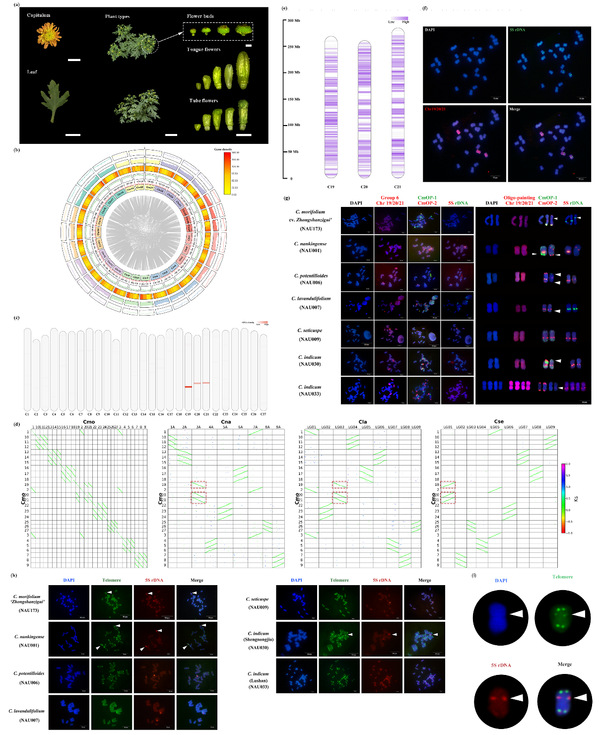 菊花(Chrysanthemum morifolium)隶属于菊科春黄菊族菊属(Chrysanthemum),是我国十大传统名花和世界四大切花之一,其基因组结构复杂。菊属植物倍性分布广泛,从二倍体到十倍体均有分布,是研究多倍体进化的理想材料。然而,由于菊属植物染色体小,相似度高,难以简单通过染色体核型分析技术及荧光原位杂交等传统细胞遗传学技术区分单条染色体,这严重阻碍了菊属不同物种间染色体进化关系和物种起源演化等研究(图1)。菊属究竟有几个染色体组,不同染色体组在菊属植物起源和演化过程中的作用是什么仍有待明确。
