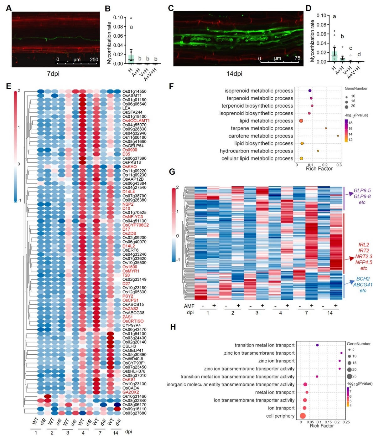 该研究通过比较WT与一系列KAR信号通路和共同共生信号通路(CSSP)中基因的突变体中这些早期应答基因对AMF响应的差异,以及对WT与KAR和CSSP信号通路不同突变体施加GR245DS、KAR1或GR24ent-5DS处理后ERGs表达水平的变化,明确了AMF在前共生期主要通过激活KAR信号通路,而不是CSSP信号通路,来调控水稻对AMF的转录应答,进而促进AMS的形成。这一过程是AMS形成所必要的。而AMF要实现在宿主植物根中的成功定殖,除了激活KAR信号通路之外,至少还需激活CSSP信号通路。