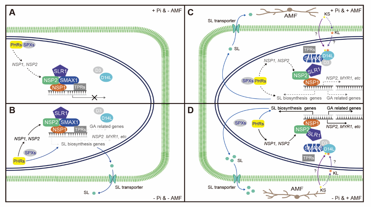 该研究揭示了NSP1-NSP2-SLR1-SMAX1模块能够整合烟素(Karrikin, KAR),赤霉素(Gibberellin, GA)和磷酸盐饥饿应答(Phosphate starvation response, PSR)等多个植物信号转导通路,是调控水稻在丛枝菌根共生(AMS)的前共生期(presymbiotic stage)对丛枝菌根真菌(AMF)转录应答及AMS建立的核心枢纽。