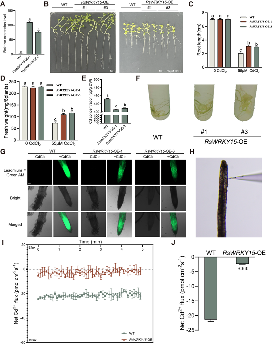 对过表达RsWRKY15的烟草进行检测发现,其根系Cd内流速率显著减少,体内Cd累积量降低(图3),表明RsWRKY15可降低植物体内Cd累积量。