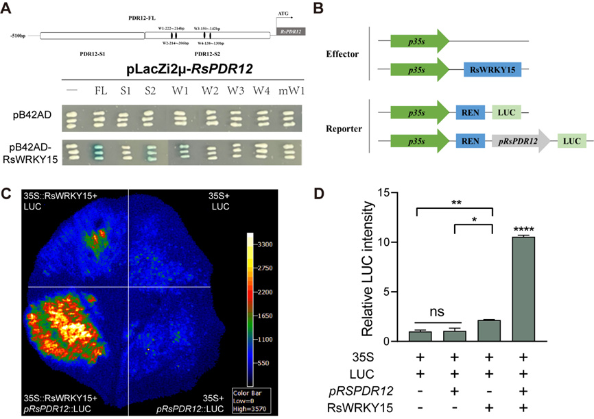 为进一步解析RsPDR12降低Cd积累的分子机制,利用酵母单杂交筛库实验鉴定到RsPDR12基因上游调控因子RsWRKY15Y1HDLA分析发现RsWRKY15可结合在RsPDR12启动子上,并激活其表达(图2)。RsWRKY15定位于细胞核,其表达受到Cd胁迫显著诱导。