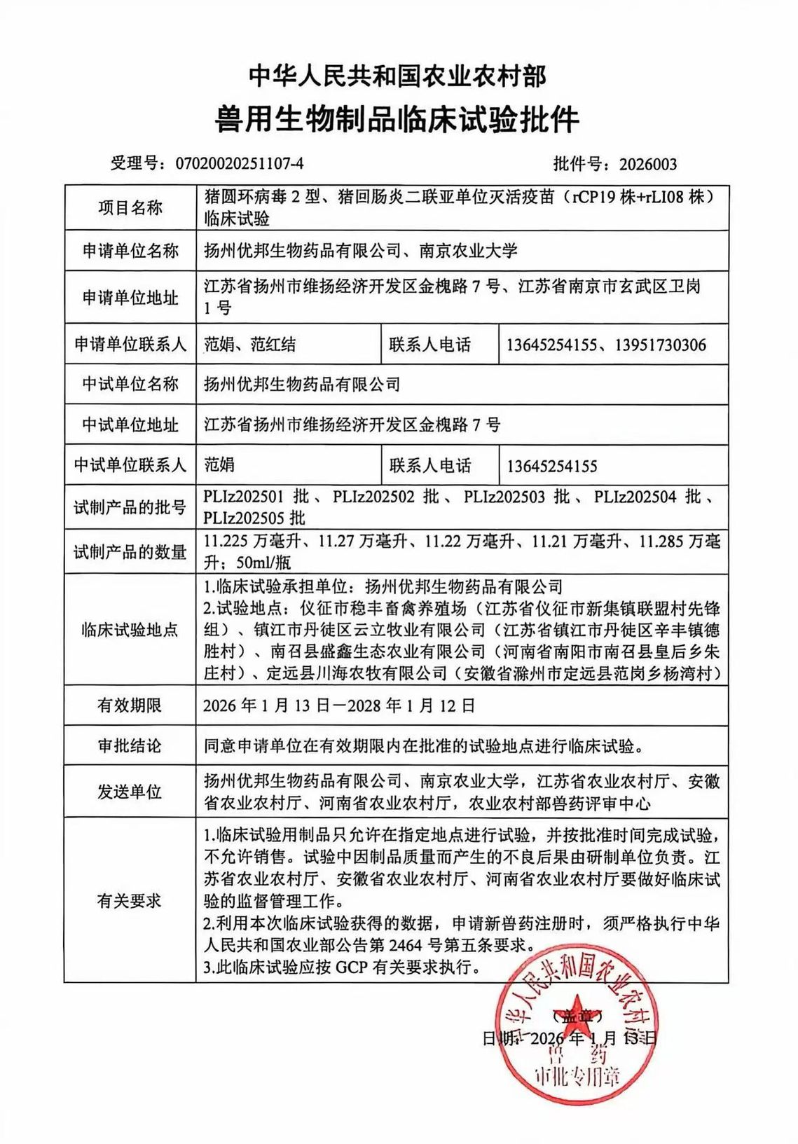 近日,由优邦生物药品有限公司与南京农业大学范红结教授团队联合研制的“猪圆环病毒2型、猪回肠炎二联亚单位灭活疫苗(rCP19株+rLI08株)”正式获得中华人民共和国农业农村部颁发的《兽用生物制品临床试验批件》(批件号:2026003),标志着该疫苗的研发工作取得关键性进展,即将进入临床试验阶段。该疫苗是针对生猪养殖中常见的圆环病毒2型感染与回肠炎的重要防控产品,其研发成功有望为养殖业提供一种安全高效的疫病防控新工具。