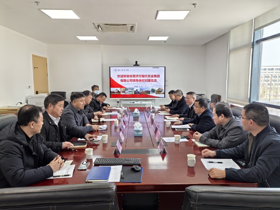 2026年3月10日上午,安徽省普济圩现代农业集团有限公司党委书记、董事长赵尚森一行来校对接交流,校社会合作处处长许承保主持座谈会,校企双方相关负责人及专家学者参会。