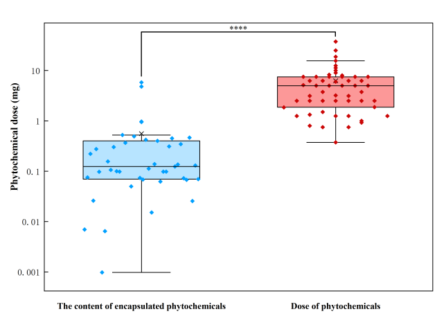 图1.现有包埋技术中植物化学物质的载量与经口有效植物化学物质浓度的对比