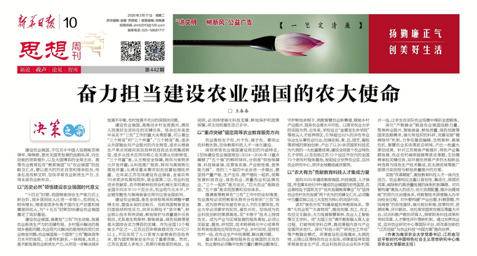 3月17日出版的《新华日报》思想周刊刊发南京农业大学党委书记、江苏省习近平新时代中国特色社会主义思想研究中心南京农业大学基地主任王春春的署名文章《奋力担当建设农业强国的农大使命》,立足高等农业教育的发展定位与实践经验,系统阐释了涉农高校服务农业强国建设的时代价值、核心路径与攻坚方向。文章强调,涉农高校要紧紧锚定国家战略需求,充分发挥农科教融合优势,以“农大有为”贡献教育科技人才集成力量。