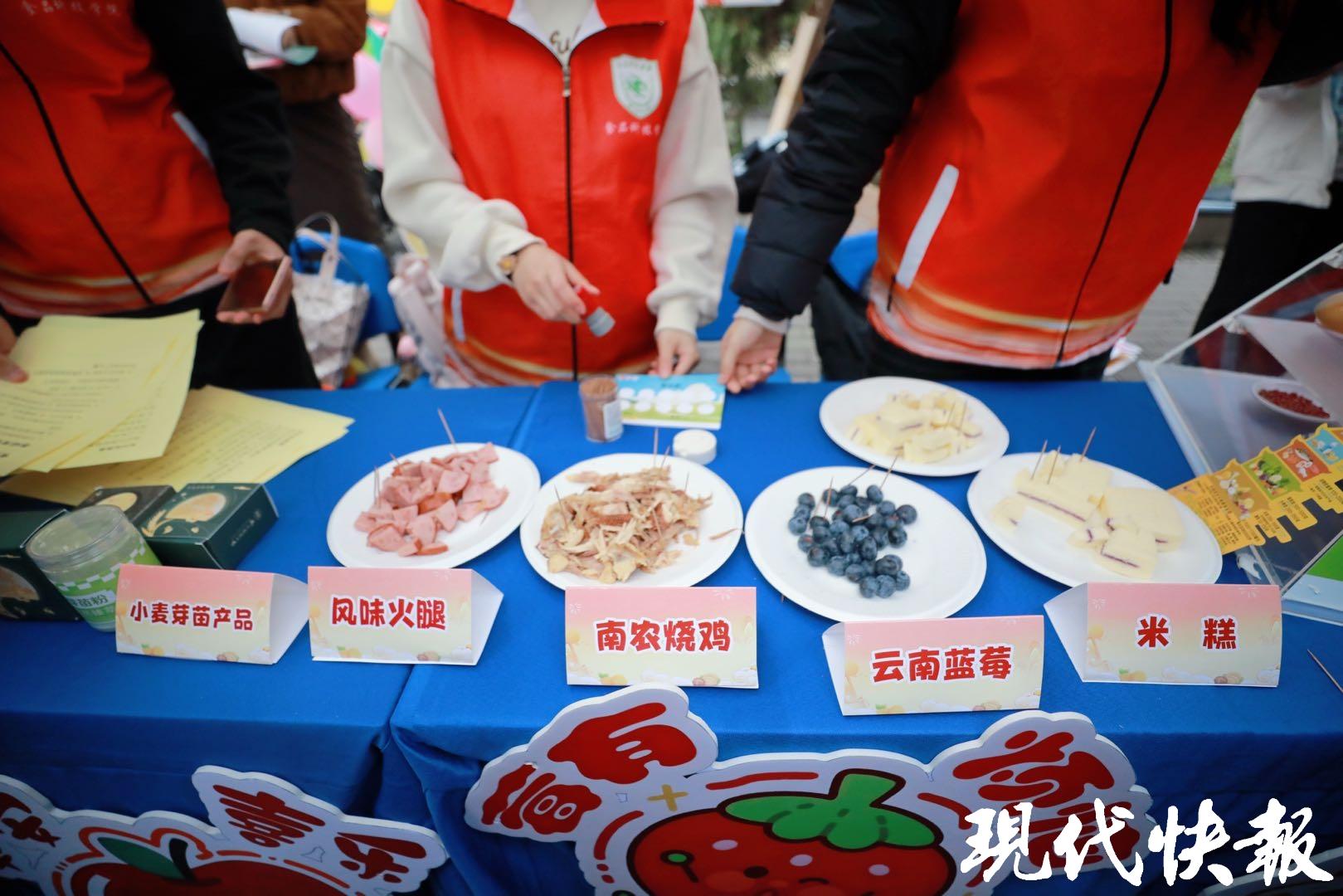 现场,食品科技学院的摊位前围满了学生,大家一边答题,学习食物营养知识,一边品尝食品科技学院带来的手作酸奶、南农烧鸡,颇受欢迎。