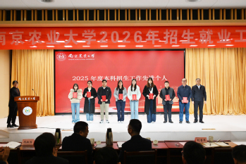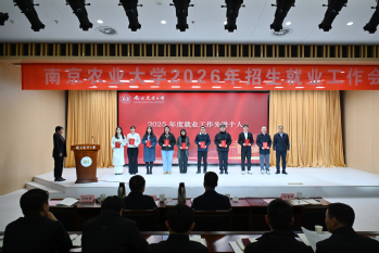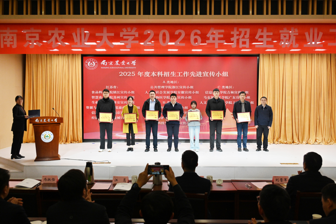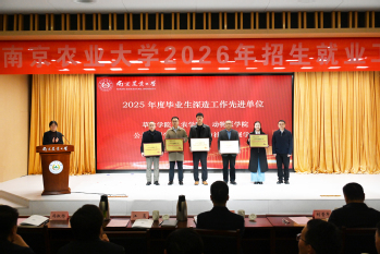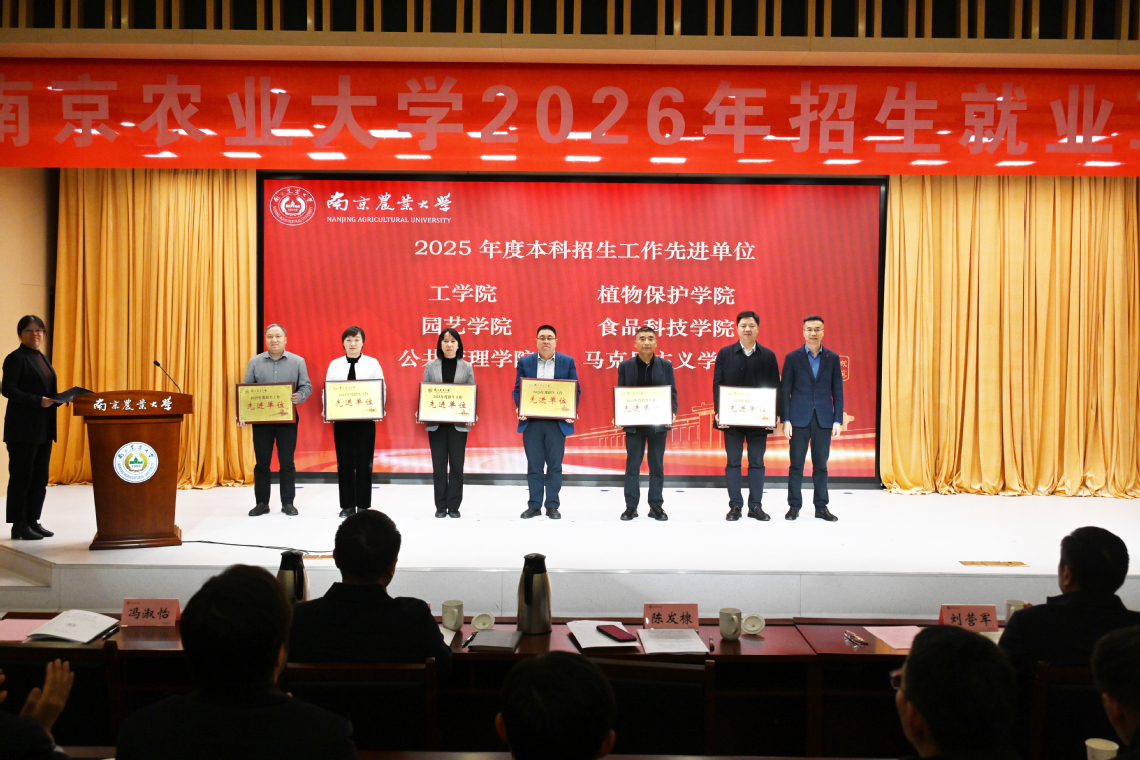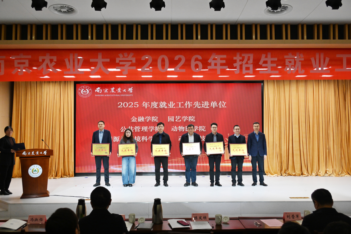 江嵩宣读表彰决定。工学院、植物保护学院、园艺学院、食品科技学院、公共管理学院、马克思主义学院6个学院荣获“2025年度招生工作先进单位”,食品科技学院镇江宣传小组等16个招生宣传小组获评“招生工作先进宣传小组”,杨润强等78人荣获“招生工作优秀教职工”称号,单宏业等48人荣获“招生工作优秀校友”称号。金融学院、园艺学院、公共管理学院、动物医学院、资源与环境科学学院、动物科技学院等6个学院获评“2025年度就业工作先进单位”,草业学院、农学院、动物医学院、公共管理学院、人文与社会发展学院5个学院获评“毕业生深造工作先进单位”,黎星辉等32人荣获“就业工作先进个人”称号。