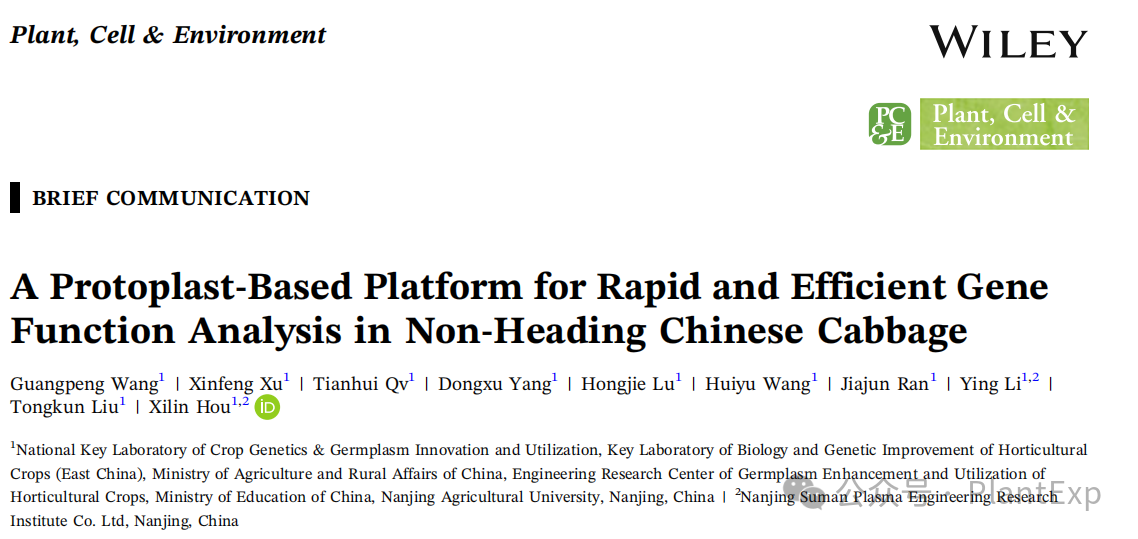 近日,《Plant, Cell & Environment》杂志在线发表了南京农业大学园艺学院侯喜林教授团队题为“A Protoplast‐Based Platform for Rapid and Efficient Gene Function Analysis in Non-Heading Chinese Cabbage”的研究论文,开发了组织和基因型非依赖的不结球白菜原生质体分离体系,并构建了整合蛋白亚细胞定位、蛋白互作验证、CRISPR/Cas9编辑预筛选以及高通量组学测序等多功能分析的高效研究平台(图1),为不结球白菜以及其他十字花科非模式蔬菜的功能基因组学研究提供了有效的工具。