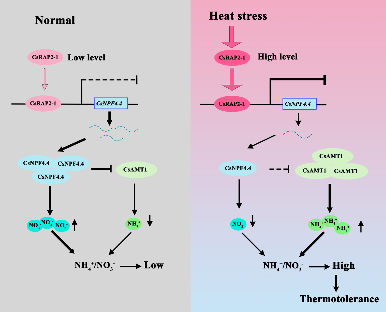 CsRAP2-1-CsNPF4.4-CsAMT1模块调控铵态氮/硝态氮比例增强黄瓜耐热性模式图