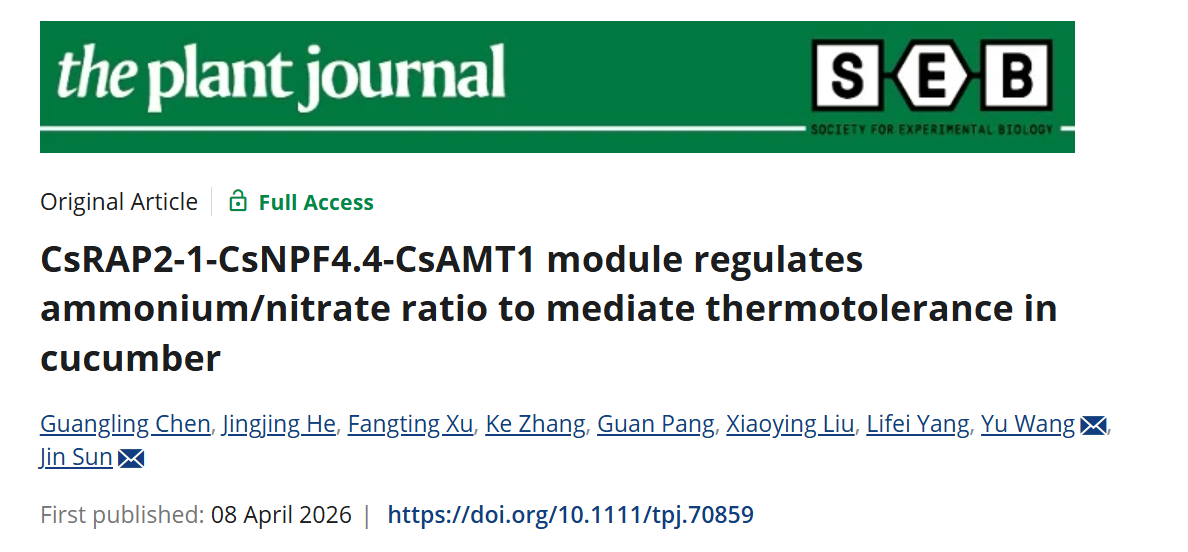 近日,南京农业大学园艺学院设施园艺团队在国际植物学期刊《The Plant Journal》在线发表题为“CsRAP2-1-CsNPF4.4-CsAMT1 module regulates ammonium/nitrate ratio to mediate thermotolerance in cucumber”的研究论文,系统揭示了CsRAP2-1-CsNPF4.4-CsAMT1模块调控NH₄⁺/NO₃⁻比例增强黄瓜(Cucumis sativusL.)耐热性的分子机制。