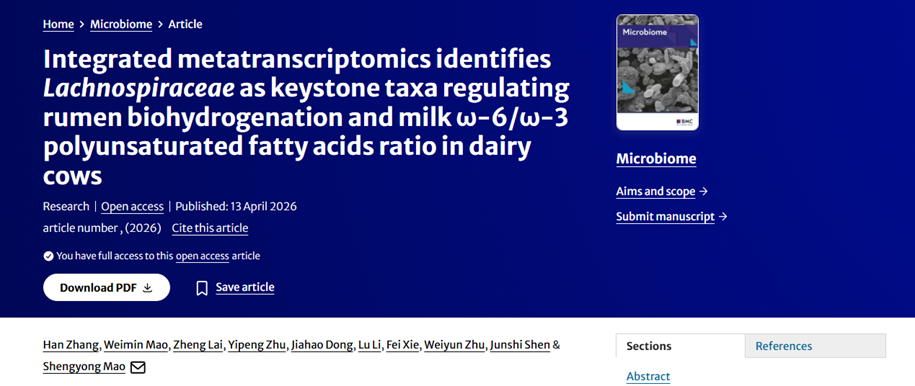 近日,南京农业大学动物科技学院毛胜勇教授团队在《Microbiome》期刊在线发表了题为“Integrated metatranscriptomics identifies Lachnospiraceae as keystone taxa regulating rumen biohydrogenation and milk ω-6/ω-3 PUFA ratio in dairy cows”的研究论文。该研究系统解析了奶牛瘤胃微生物影响乳脂中ω-6/ω-3 多不饱和脂肪酸(PUFA)比值的机制,鉴定出关键调控菌群Lachnospiraceae,为通过瘤胃微生物组干预乳品质提供了科学依据。