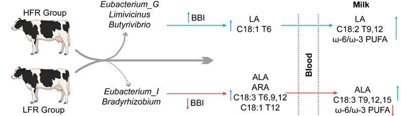 本研究中,团队系统分析了95头荷斯坦奶牛的乳脂脂肪酸组成及瘤胃微生物群落结构,发现瘤胃微生物可解释乳脂ω-6/ω-3 PUFA比值变异的41.0%。进一步比较高、低ω-6/ω-3 PUFA比值组奶牛发现,两组奶牛瘤胃微生物在代谢α-亚麻酸(C18:3)和亚油酸(C18:2)方面存在显著差异,而引起这一差异的关键微生物属于毛螺菌科(Lachnospiraceae)。基于瘤胃微生物培养组学研究进一步发现,高比值组奶牛瘤胃中富集的丁酸弧菌属(Butyrivibrio)分离株能够将α-亚麻酸氢化为硬脂酸,而低比值组中富集的真杆菌属(Eubacterium)分离株则倾向于代谢亚油酸。这种不同个体瘤胃内优势微生物的差异化生物氢化模式,构成了奶牛个体间乳脂ω-6/ω-3 PUFA比值变异的微生物学基础。该研究不仅揭示了瘤胃微生物在乳脂脂肪酸代谢中的核心调控作用,也为通过靶向调控瘤胃微生物来开发营养强化型乳制品提供了新的研究方向。
